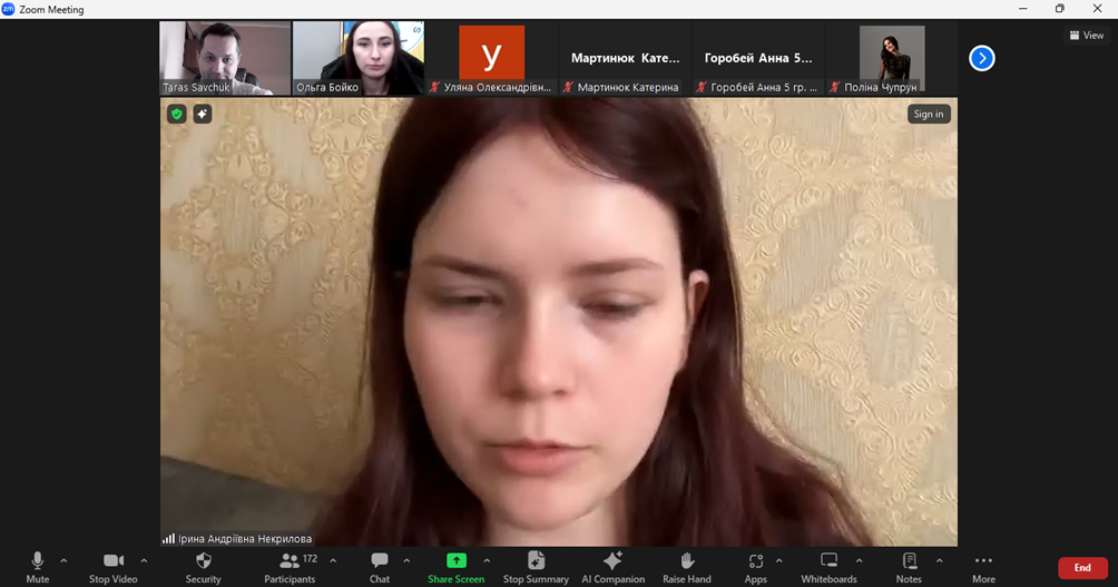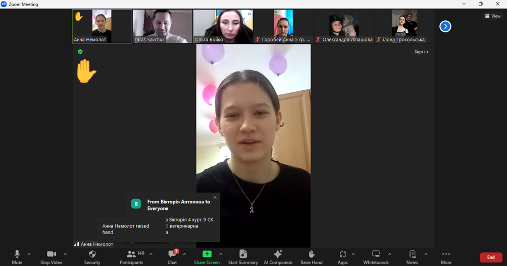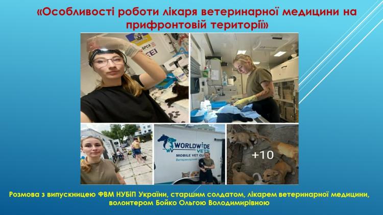 17 лютого 2026 р. на факультеті ветеринарної медицини відбувся навчально‑виховний захід на тему «Особливості роботи лікаря ветеринарної медицини на прифронтовій території». Розмова з випускницею факультету ветеринарної медицини НУБіП України, старшим солдатом, лікарем ветеринарної медицини, волонтером Ольгою БОЙКО.