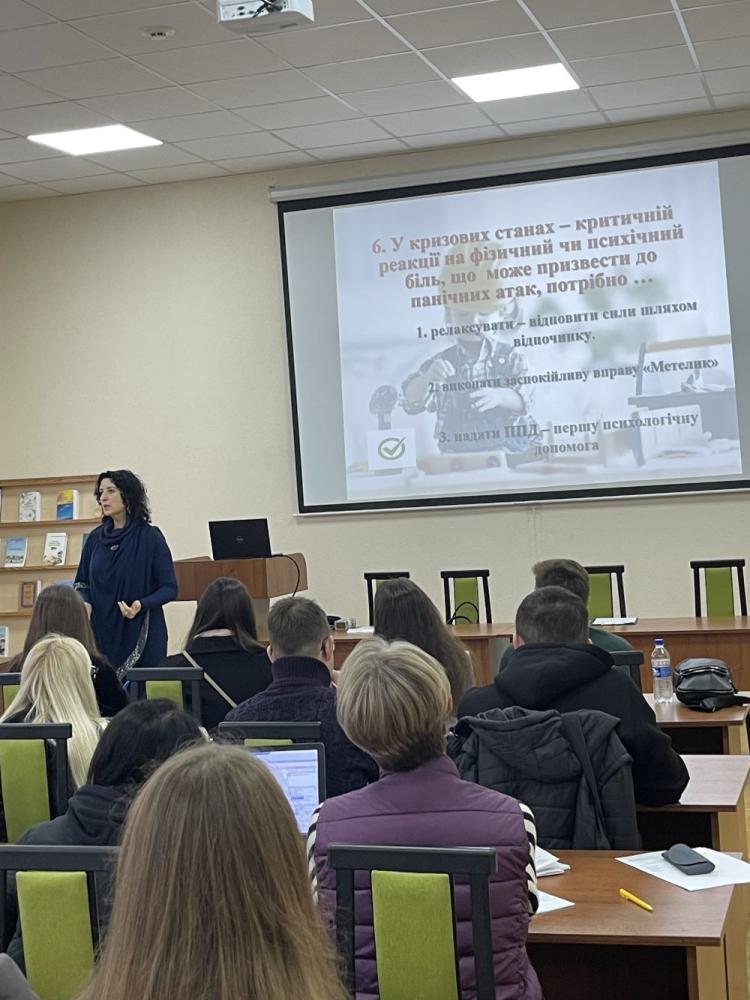 Поточно працювали із лінгвопсихологічними прийомами міжособистісної взаємодії. Також поточно аналізували (для удосконалення) спеціально розроблену проф. Осадченко І. І. пам’ятку першої емоційної підтримки.