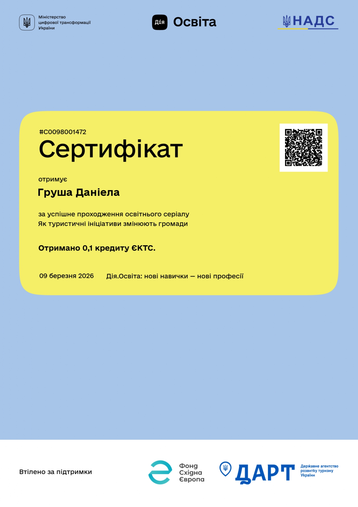 Кафедра готельно-ресторанної справи та туризму підтримує ініціативність здобувачів щодо участі у програмах неформальної освіти, що сприяє формуванню конкурентоспроможних фахівців, здатних ефективно працювати в умовах сучасних викликів та динамічного розвитку туристичної індустрії.