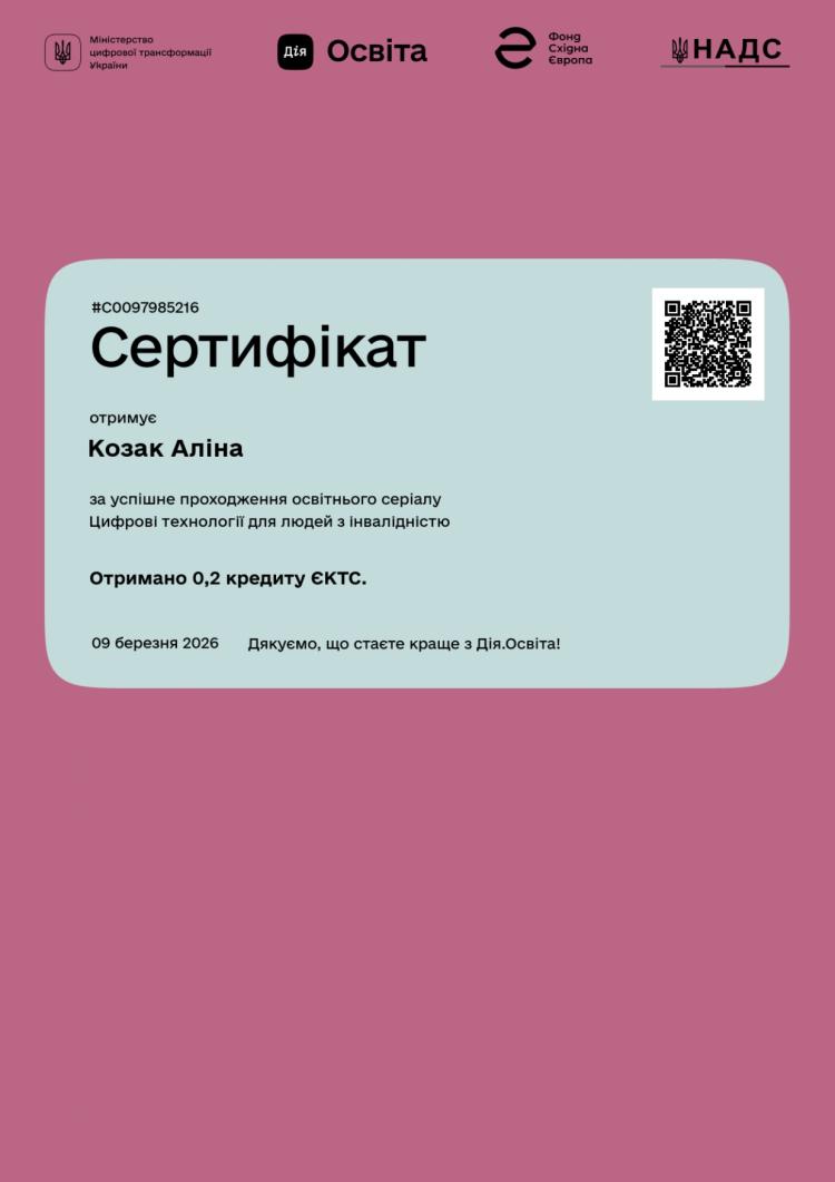 Зокрема, здобувачі ступеня вищої освіти «бакалавр» Олександра КОБІЧУК, Даніела ГРУША, Аліна КОЗАК, Ангеліна СІРЕНКО, Анастасія МАРОЩУК, Михайло ЛУКАШЕВИЧ брали участь у програмах неформальної освіти та успішно підтвердили результати навчання відповідними сертифікатами. Під час проходження освітніх курсів студенти ознайомилися з актуальними питаннями використання цифрових технологій для забезпечення доступності інформації та сервісів для людей з інвалідністю, а також дослідили роль туристичних ініціатив у розвитку місцевих громад.