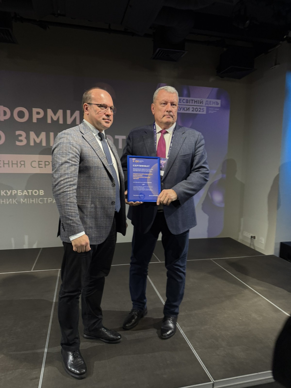 В межах заходу відбулося вручення атестатів про попередню атестацію наукової діяльності за двома напрямами – «Біомедичний» та «Гуманітарно-мистецький». Національний університет біоресурсів і природокористування України отримав сертифікат категорії «Б» за гуманітарно-мистецьким напрямом. Ректору Вадиму ТКАЧУКУ його вручив заступник Міністра освіти і науки України Денис КУРБАТОВ.