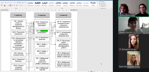 Обговорення відбувалося за участю гаранта ОПП - Ольги ГОГУЛІ, кандидата економічних наук, доцента кафедри менеджменту ім. проф. Й. С. Завадського, а також членів проєктної групи: Тетяни БАЛАНОВСЬКОЇ, кандидата економічних наук, професора, завідувача кафедри; Оксани ГАВРИШ та Кристини ДРАМАРЕЦЬКОЇ, кандидатів економічних наук, доцентів кафедри менеджменту ім. проф. Й. С. Завадського, а також здобувача другого (магістерського) рівня вищої освіти Вікторії СІДЕНКО.