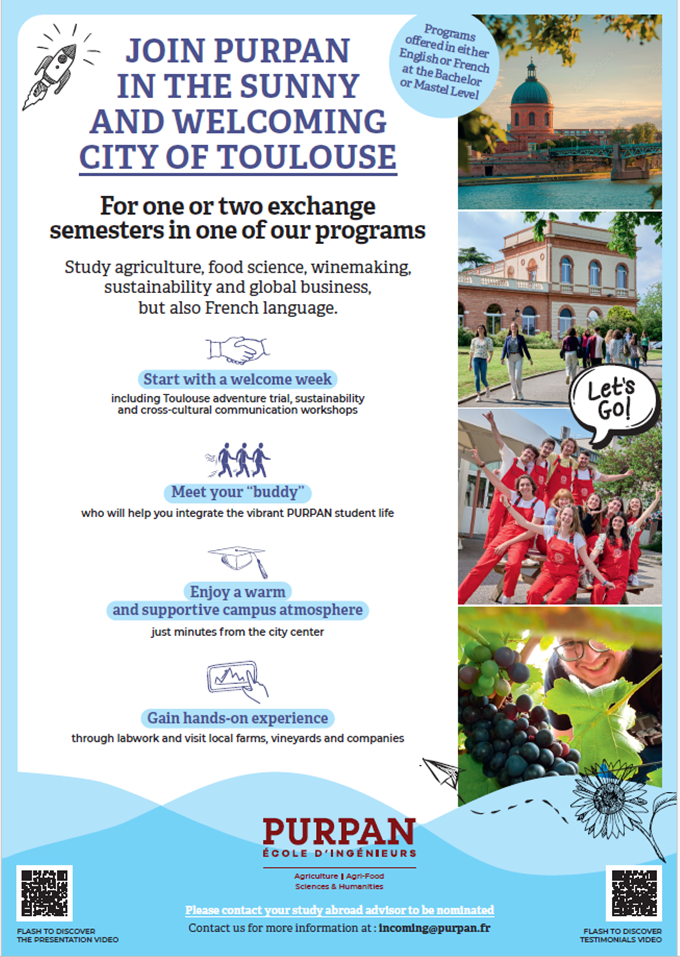 У рамках програми міжнародної кредитної мобільності Erasmus+ та міжуніверситетської угоди між НУБіП України та Інженерною школою PURPAN (Франція) оголошується відбір студентів для навчання на другий навчальний семестр 2025-2026.