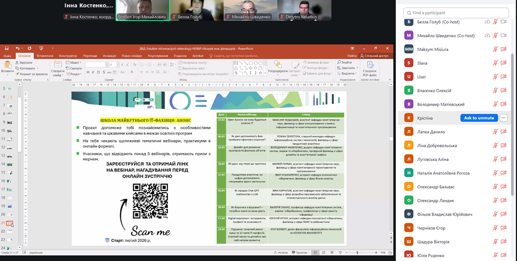 Окрему увагу було приділено особливостям вступу у 2026 році, а також анонсовано Онлайн-школу майбутнього ІТ-фахівця та можливостям щодо доступу до профорієнтаційних тестів на ІТ та бізнес тип професій, отриманню індивідуальних консультацій екскурсій кампусом (https://linktr.ee/it_nubip_department).