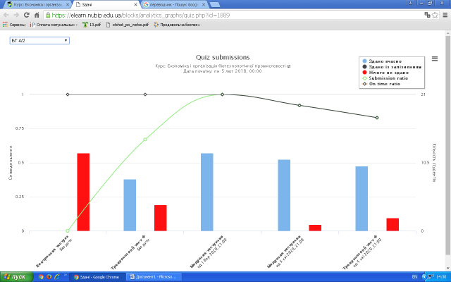 На факультеті захисту рослин, біотехнологій та екології 4 курс ОС «Бакалавр» спеціальністі 162 «Біотехнології та біоінженерія» опановує дисципліну «Економіка і організація біотехнологічної промисловості» за допомогою сертифікованого курсу на платформі «Еlearn». Зареєстровано на курсі 31 студент денної та 11 студентів заочної форми навчання. На наведених нижче графіках видно динаміку роботи студентів, яка характеризується періодичністю відповідно до розкладу.