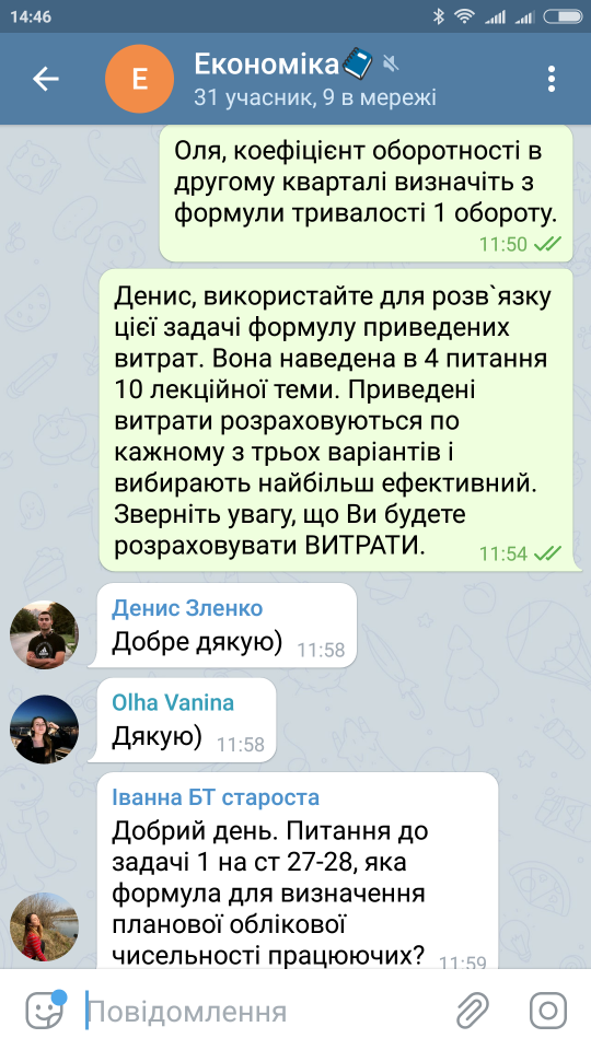 Наразі завдяки електронному курсу на платформі «Еlearn», а також месенджерам та соціальним мережам забезпечується постійний зв’язок зі студентами, які активно задіяні в освітньому процесі. Була створена група у програмному забезпеченні «Telegram », де відбувається постійне «живе» спілкування із викладачем, яка анонсує про наступні теми, надає перелік онлайн-ресурсів вивчення матеріалу, вказує на види завдань та терміни їх здачі, а студенти, в свою чергу, дискутують з професійних питань, отримують компетентні відповіді та поради.