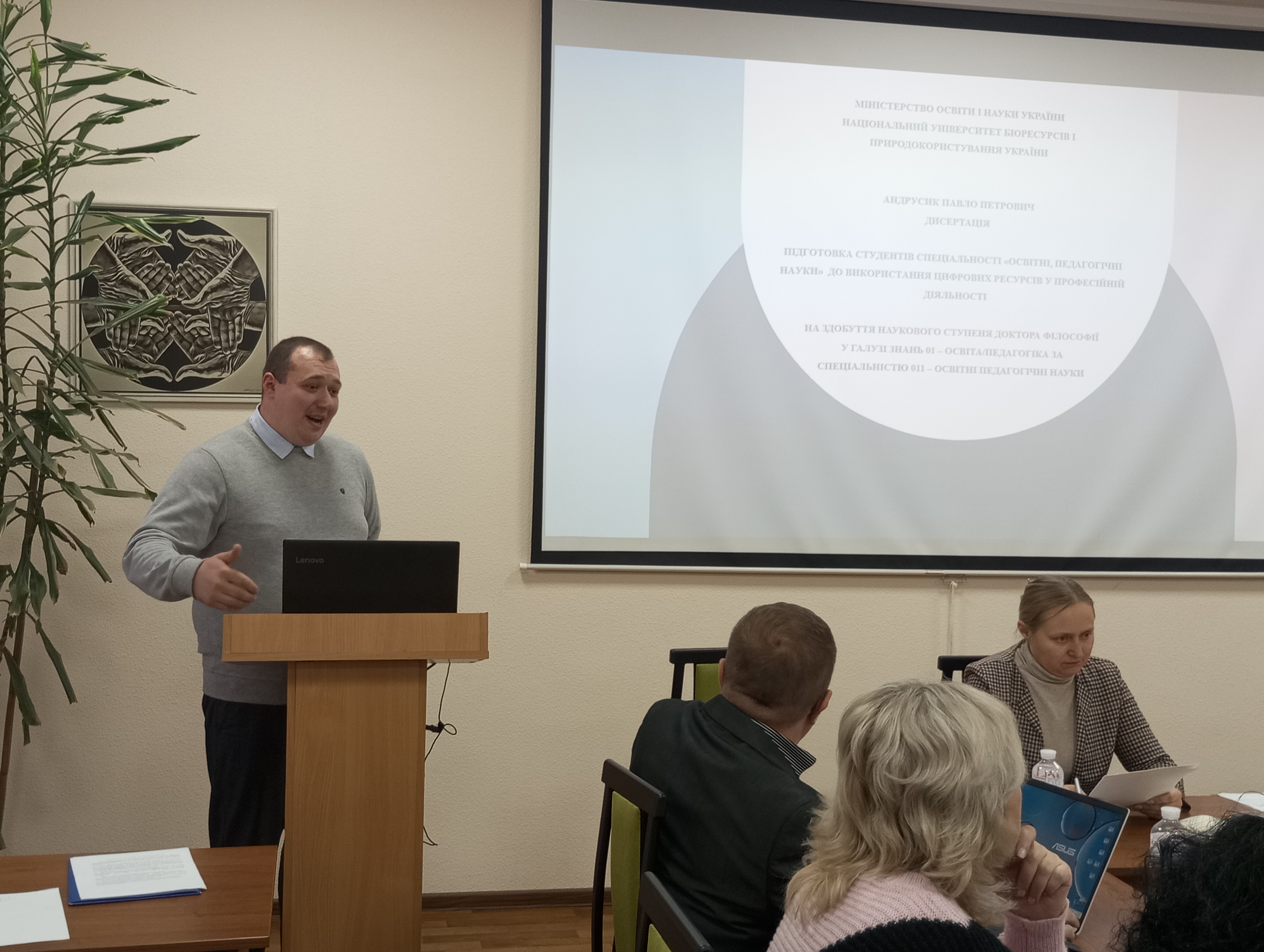 Першим доповідь тримав Павло Андрусик, який спрезентував результати дисертації на тему: «Підготовка студентів спеціальності «Освітні, педагогічні науки» до використання цифрових ресурсів у професійній діяльності».
