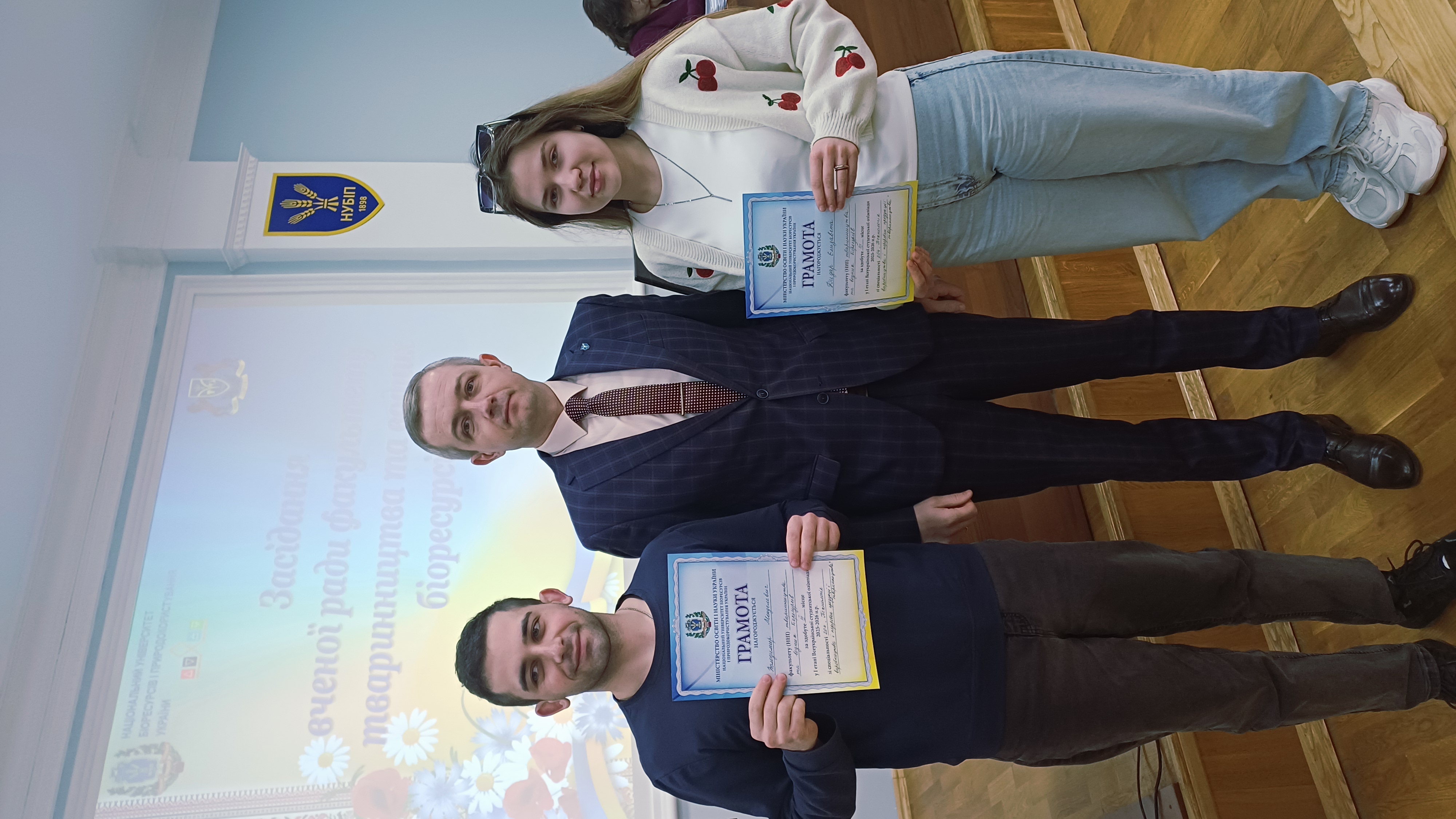 зі спеціальності 207 – «Водні біоресурси та аквакультура» студентам які зайняли: І місце — Михайло САВЧУК, ІІ місце — Жанна ЯЗИКОВА та Єлизавета ДЬОШИНА, ІІІ місце — Андрій КОРОЛЬ та Дарія МОЗГОВА.