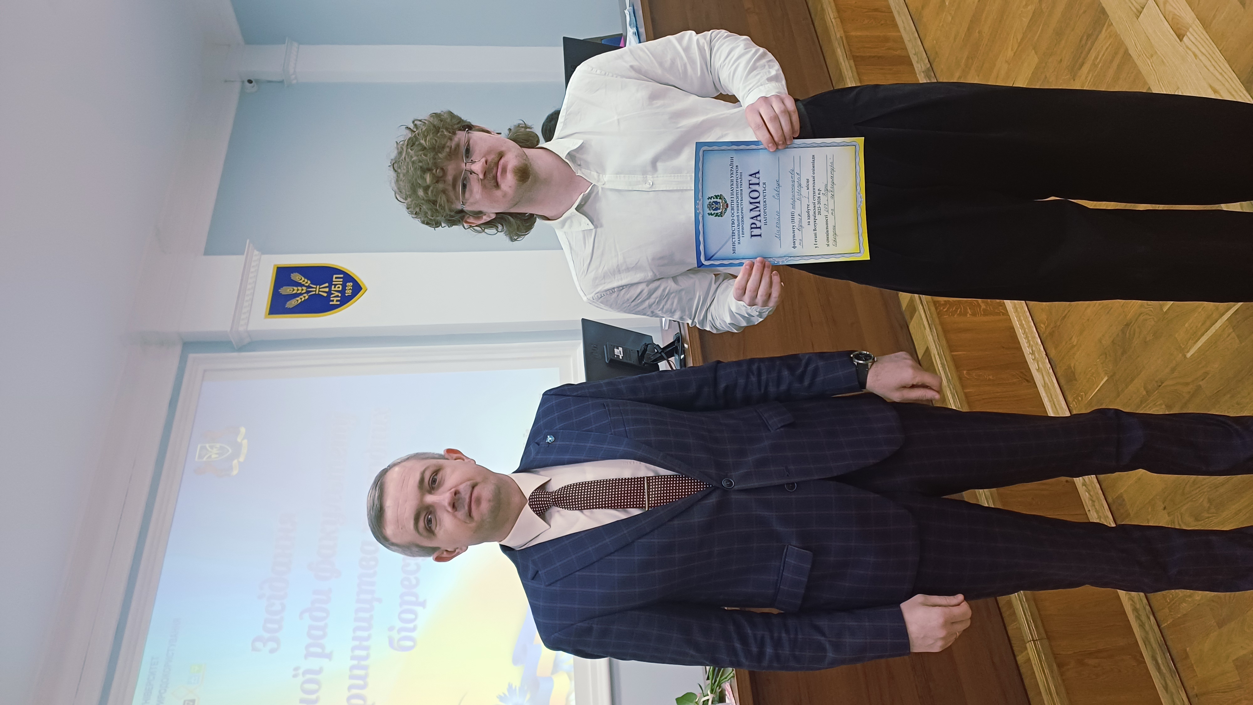 Потому декан вручив нагороди за кращі студентські наукові роботи І туру Всеукраїнського конкурсу студентських наукових робіт з галузей знань і спеціальностей у 2025/2026 навчальному році: