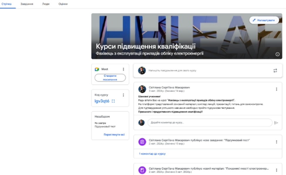 Тематичний план передбачає комплексну професійну підготовку та доповнена актуальним навчально-методичним забезпеченням, а також структурованими модулями, інтегрованими до платформи неформальної освіти інституту, що забезпечує гнучкість навчального процесу та відповідність сучасним потребам енергетичної галузі. У межах курсу слухачі отримали доступ до теоретичних матеріалів, практичних занять, завдань для самоперевірки, тестового модуля. Такий підхід забезпечує максимально ефективне засвоєння матеріалу та сприяє формуванню актуальних професійних компетентностей, необхідних для роботи в сучасних електроенергетичних системах.