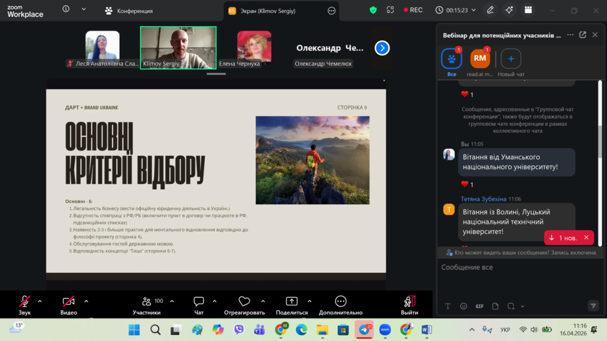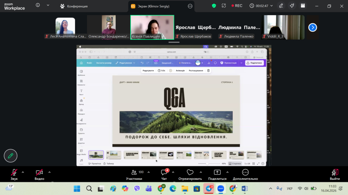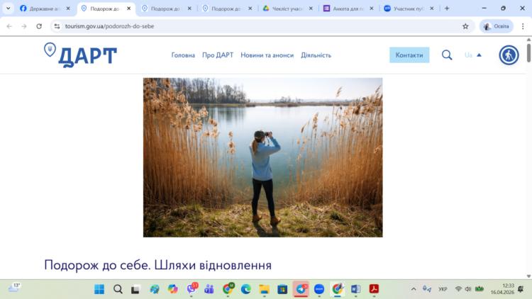 16 квітня 2026 року відбувся відкритий вебінар, присвячений впровадженню національної програми «Подорож до себе». У заході брали участь гаранти освітньо-професійних програм «Туризм», «Міжнародний туризм» і «Готельно-ресторанна справа», науково-педагогічні працівники кафедри та здобувачі вищої освіти бакалаврського і магістерського рівнів.