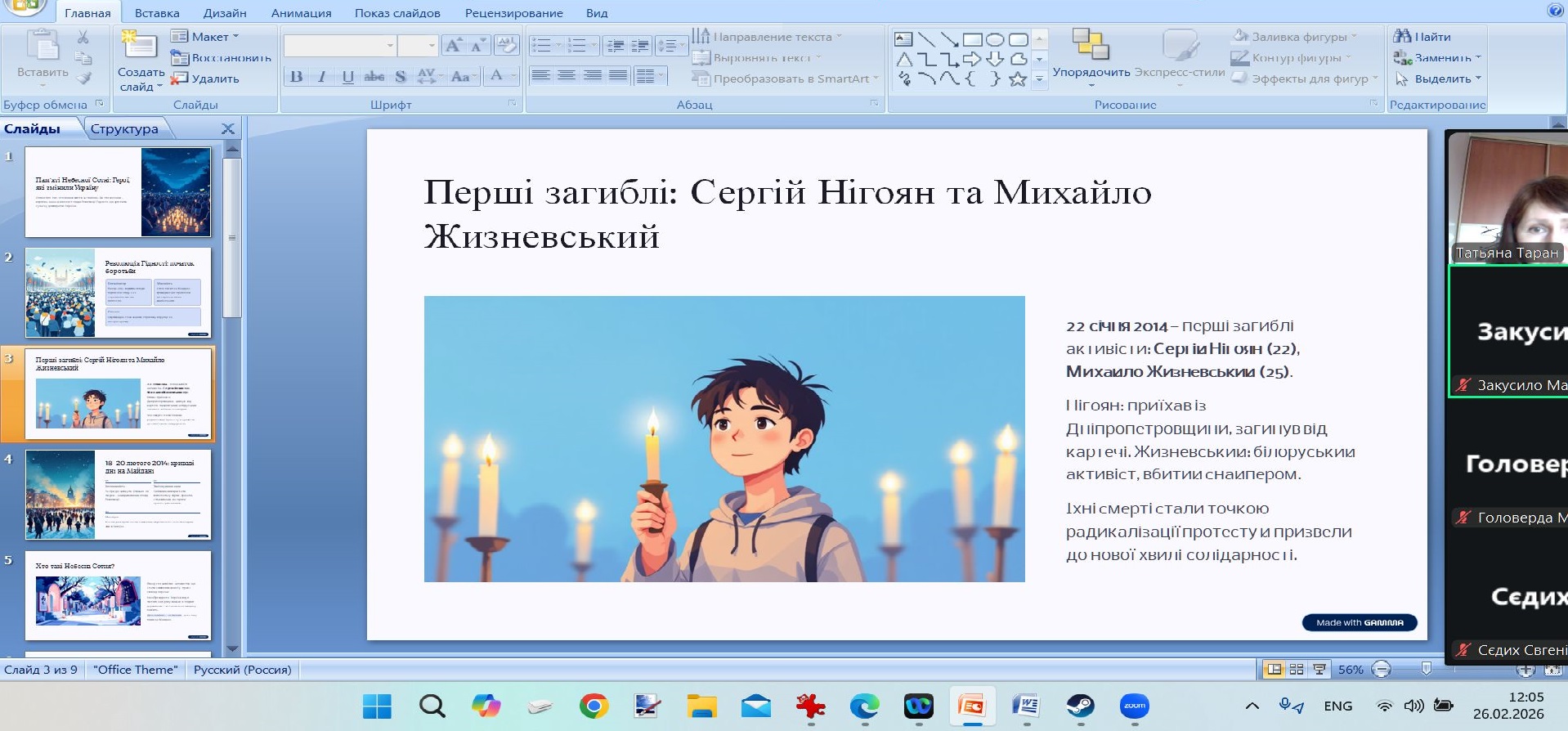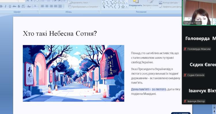 Під час організаційної години студенти переглянули інформаційні матеріали та відеосвідчення очевидців подій Революція Гідності. У ході обговорення йшлося про причини протестів, їхній вплив на суспільно-політичні процеси в країні, а також про значення громадянської активності у формуванні демократичного суспільства. Студенти активно долучилися до розмови, висловлювали власні думки та розмірковували над тим, якою ціною виборюється свобода.