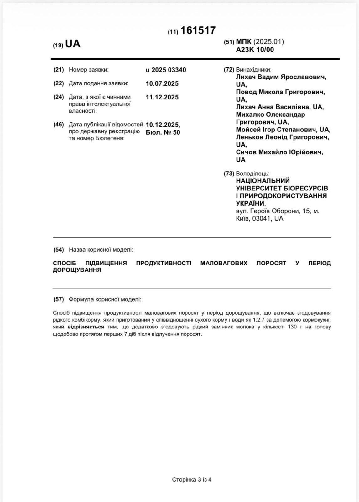 Вагомим результатом синергічної діяльності з НПП кафедр: технологій у тваринництві проф. Видимом ЛИХАЧЕМ, годівлі тварин та технології кормів ім. П. Д. Пшеничного – проф. Михайлом СИЧОВИМ, Сумського НАУ – проф. Миколою ПОВОДОМ, доц. Олександром МИХАЛКОМ і головного технолога НВК «Глобине» – Ігорем МОЙСЕЄМ, стало отримання патенту України на корисну модель № 161517 «Спосіб підвищення продуктивності маловагових поросят у період дорощування», зареєстрованого 10 грудня 2025 року. Запропонована розробка спрямована на вирішення однієї з актуальних проблем промислового свинарства – зниження продуктивності та адаптаційної здатності маловагових поросят у післявідлучний період, який є критичним етапом у технології вирощування молодняку.