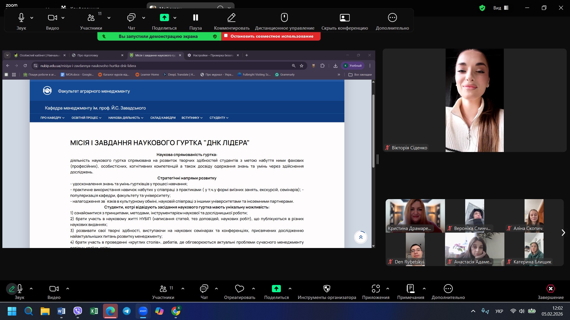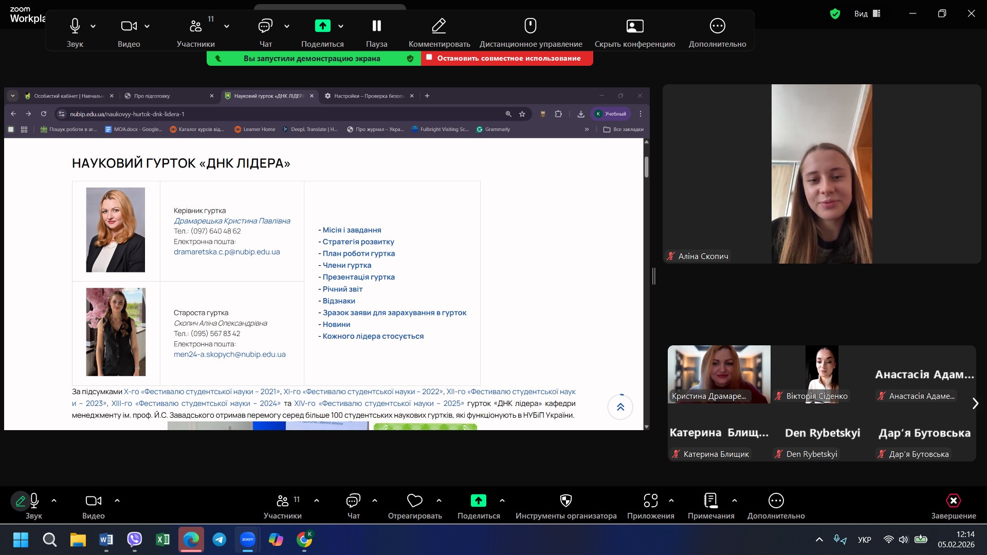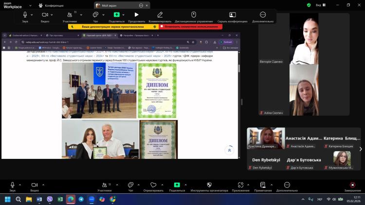 5 лютого 2026 року відбулася чергова зустріч учасників студентського наукового гуртка «ДНК Лідера», під час якої було розглянуто питання оновлення складу гуртка. У заході взяли участь здобувачі вищої освіти, керівник гуртка Кристина ДРАМАРЕЦЬКА та староста гуртка Вікторія СІДЕНКО. У ході зустрічі було підбито підсумки діяльності гуртка за попередній період, зокрема щодо участі гуртківців у наукових заходах, підготовки тез доповідей та інших результатів студентської наукової роботи.
