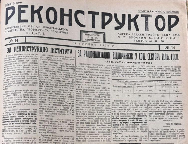 Газета «Реконструктор» виходила з 29 січня 1929 р. до 24 червня 1930 р. Загалом вийшло 25 номерів. Оглядово про газету ми писали тут https://nubip.edu.ua/news/rekonstruktor-pershyy-drukovanyy-chasopys-kyyivskoho-silskohospodarskoho-instytutu-1929-1930-0