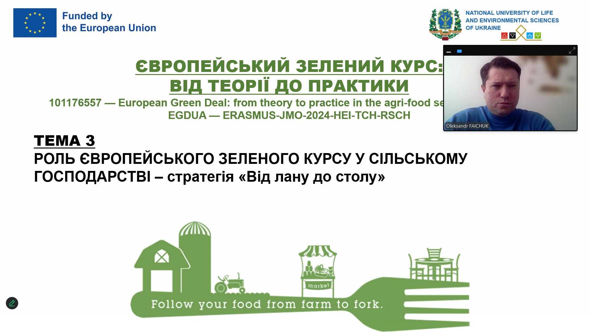 За перший місяць навчання слухачі мали змогу прослухати від доцента кафедри адміністративного менеджменту та ЗЕД Олександра ФАЙЧУКА лекції присвячені розкриттю сутності та особливостей Європейської зеленої угоди та її ролі у сучасній трансформації сільського господарства. Також не менш цікавими виявились й практичні заняття. Тут студенти, крім поглиблення розуміння напрямів Зеленої угоди ЄС, також вчились оцінювати прогрес різних країн-членів ЄС та України, як країни-кандидата на вступ до ЄС, у досягненні цілей стратегії «Від ферми до виделки» до 2030 р. через аналіз цільових індикаторів (використання пестицидів, втрати поживних речовин, використання мінеральних добрив, продажу антибіотиків для застосування у тваринництві, розширення площ під органічне землеробство). З метою кращого засвоєння навчального матеріалу викладачем було застосовано сучасні аудіо-візуальні методи.