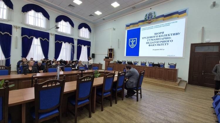 18 грудня відбулися збори трудового колективу гуманітарно-педагогічного факультету НУБіП, участь у яких взяла також і кафедра англійської філології. Очільниця кафедри, Клименко Людмила Володимирівна, увійшла до президії факультету у той час, як решта науково-педагогічних працівників зайняли свої місця у глядацькій частині актової зали.