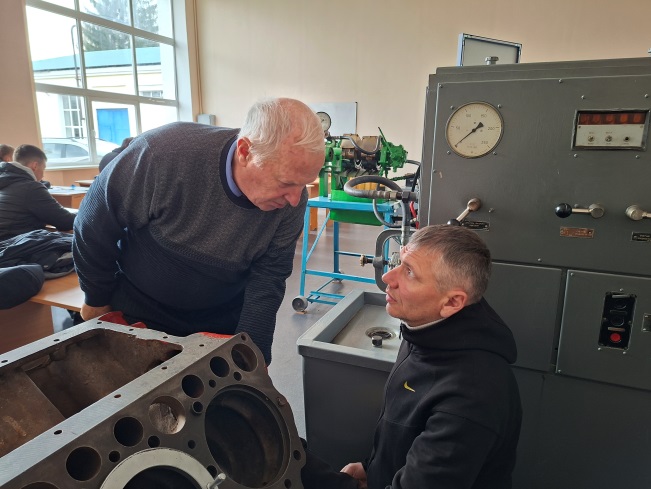 Завідувач лабораторіями Юрій Лисіков разом з майстром виробничого навчання Серафимом Лопатьком оцінюють технічний стан деталей та встановлюють можливість їх відновлення. |
