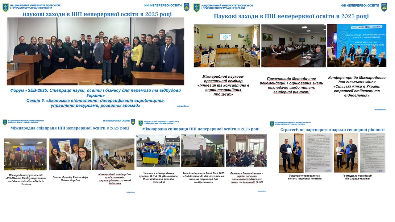 Інститут є активним учасником університетських та міжнародних заходів. Ключовою подією 2025 року стало проведення Форуму «SEB-2025: Співпраця науки, освіти і бізнесу для перемоги та відбудови України», зокрема секції «Економіка відновлення: диверсифікація виробництва, управління ресурсами, розвиток громад», у межах якої ННІ неперервної освіти виступив одним з організаторів.