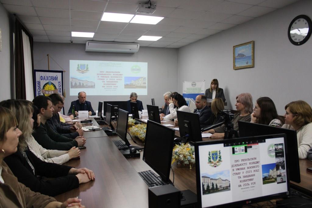 Під час виступу керівником було узагальнено результати діяльності коледжу за 2025 рік, який проходив у складних умовах воєнного стану. Проаналізовано роботу структурних підрозділів, окреслено досягнення та проблемні питання. Попри складні умови воєнного часу, колектив коледжу продемонстрував високий рівень організованості, професійності та стійкості, забезпечивши стабільність освітнього процесу й належний рівень безпеки всіх учасників освітнього середовища.
