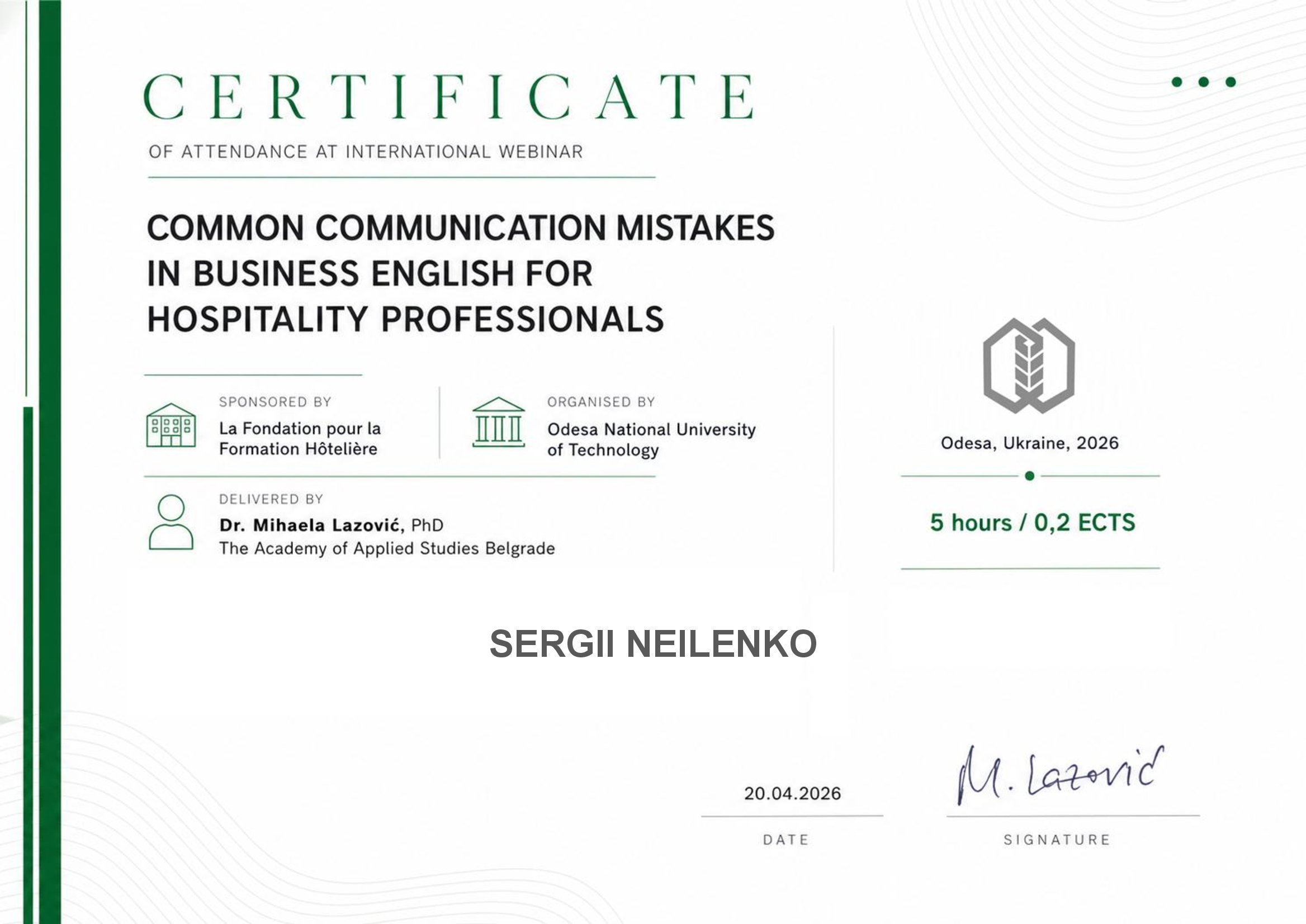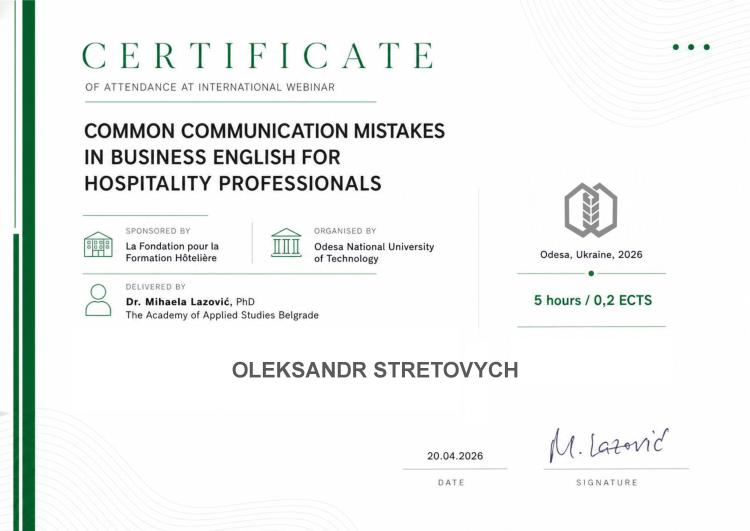 Спікеркою заходу виступила Dr Mihaela Lazović, PhD — професорка The Academy of Applied Studies Belgrade (Сербія), експертка з ділової англійської мови та професійної комунікації у сфері гостинності. У межах вебінару було висвітлено актуальні проблеми використання бізнес-англійської у професійній діяльності, зокрема типові помилки у спілкуванні з клієнтами та партнерами, а також шляхи їх уникнення.