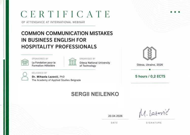 Науково-педагогічні працівники кафедри готельно-ресторанної справи і туризму економічного факультету НУБіП України брали участь у міжнародному вебінарі «COMMON COMMUNICATION MISTAKES IN BUSINESS ENGLISH FOR HOSPITALITY PROFESSIONALS».