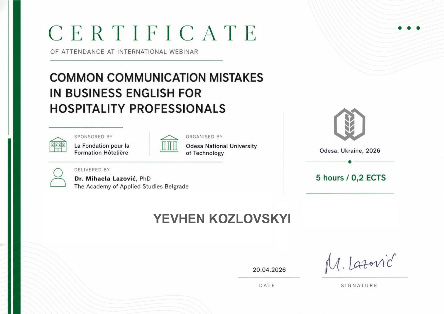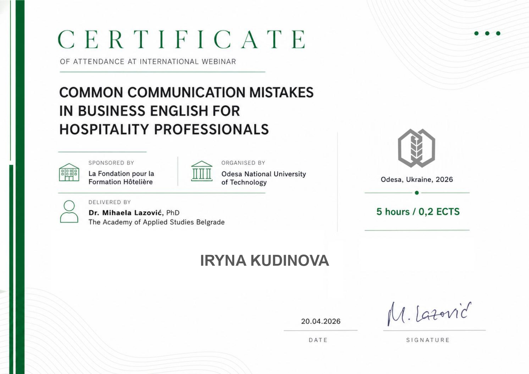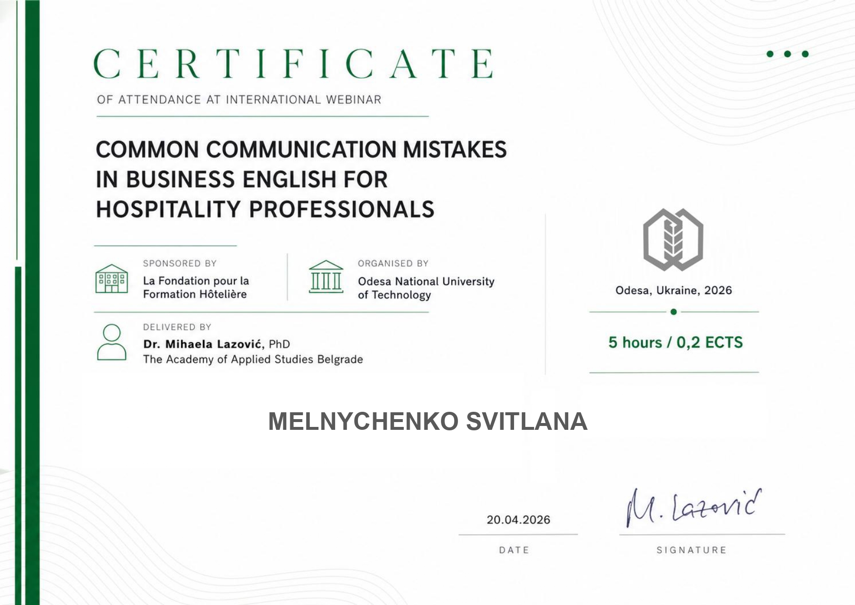Науково-педагогічні працівники кафедри готельно-ресторанної справи і туризму економічного факультету НУБіП України брали участь у міжнародному вебінарі «COMMON COMMUNICATION MISTAKES IN BUSINESS ENGLISH FOR HOSPITALITY PROFESSIONALS».