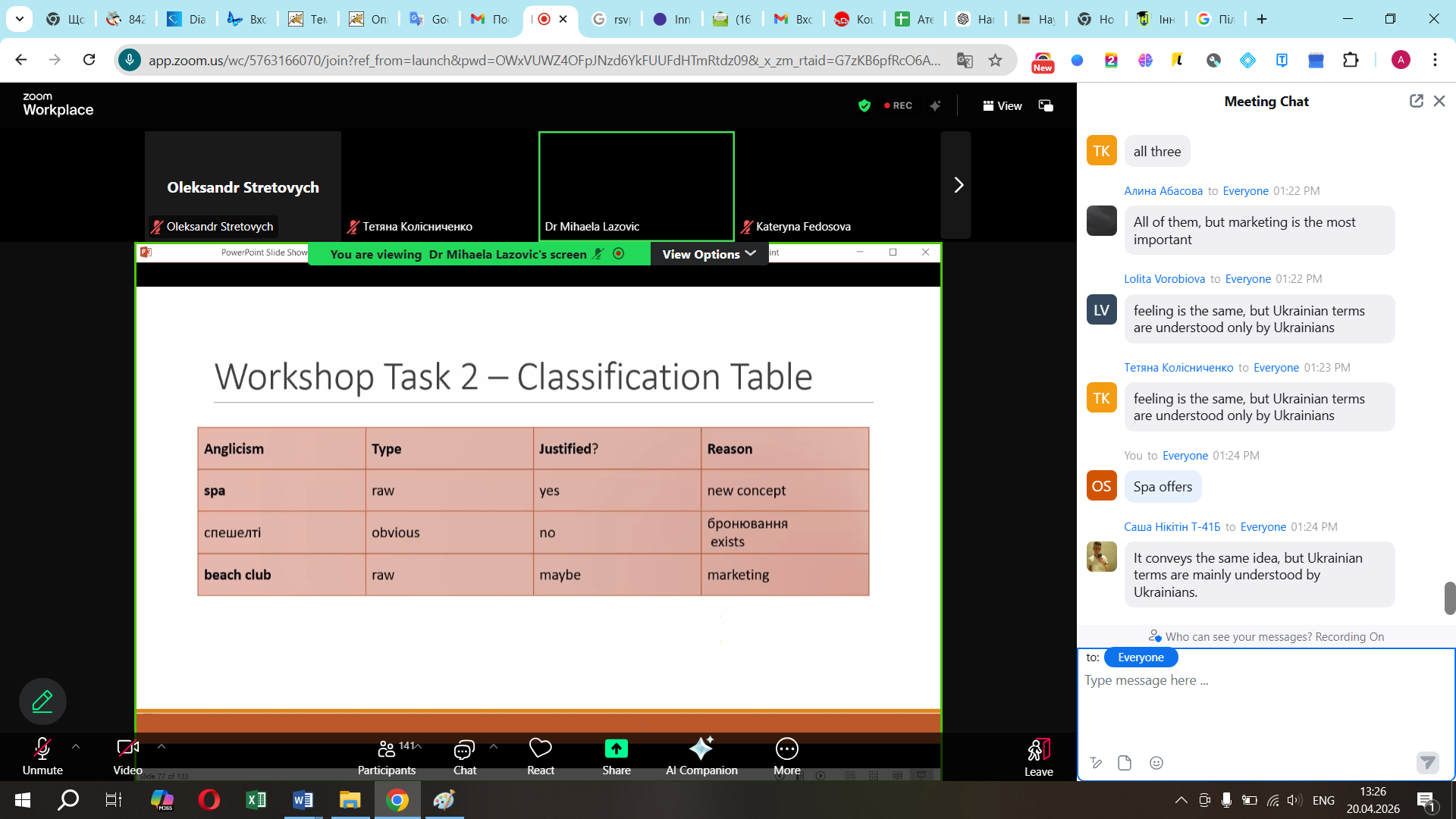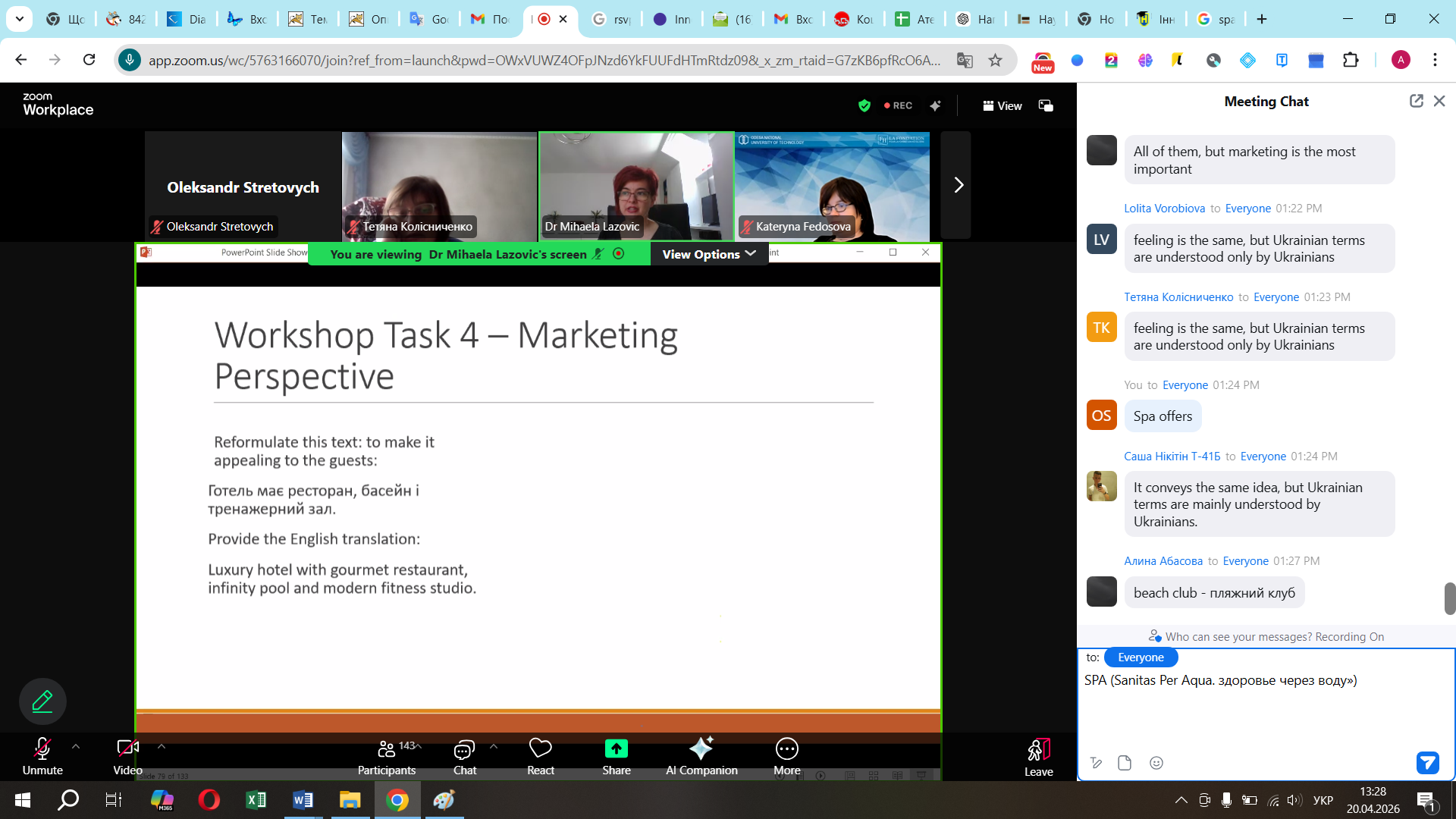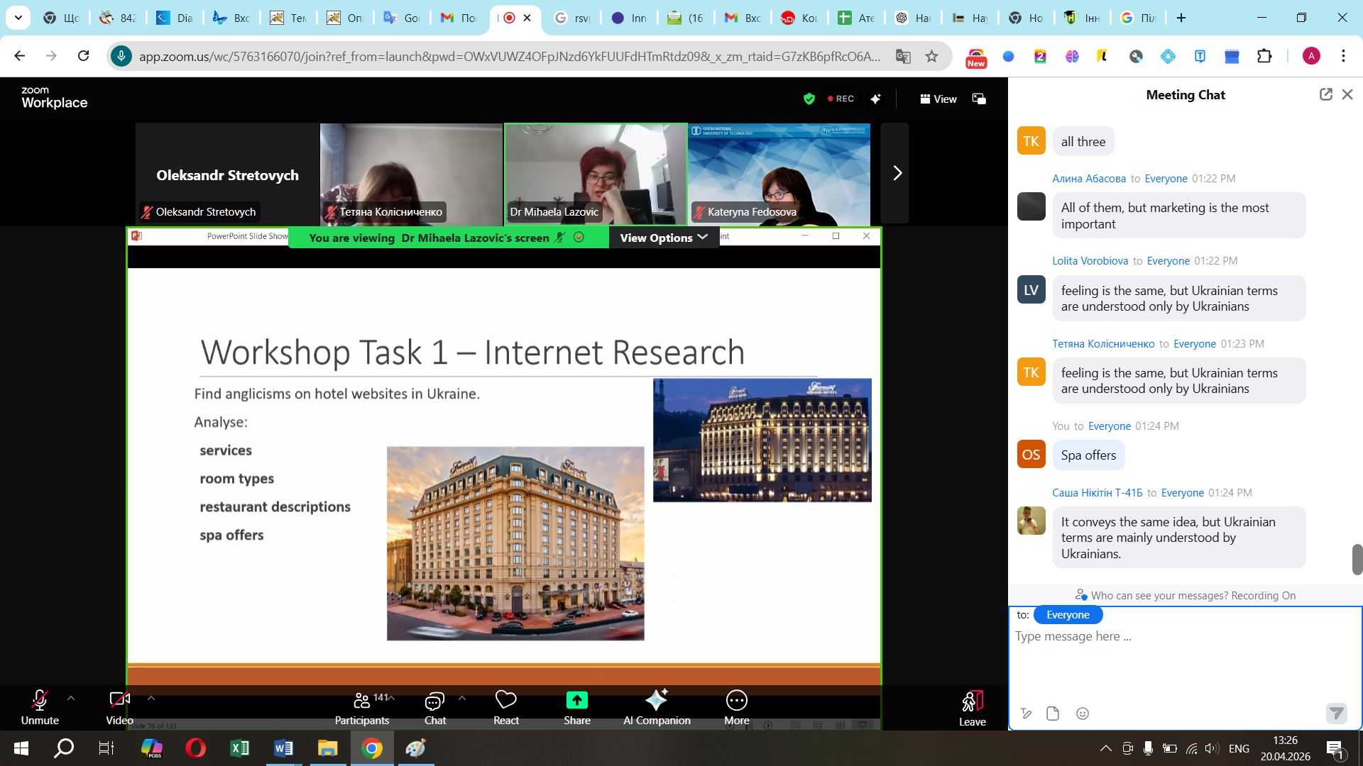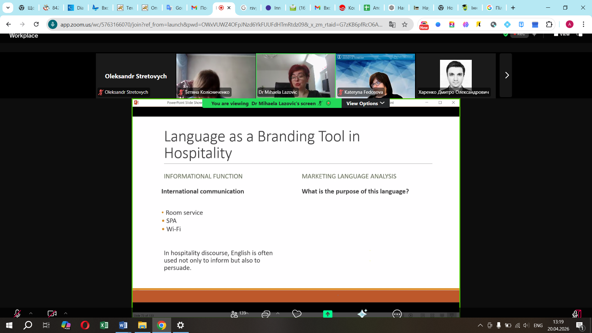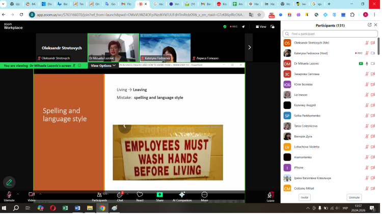 Спікеркою заходу виступила Dr Mihaela Lazović, PhD – професорка The Academy of Applied Studies Belgrade (Сербія), експертка з ділової англійської мови та професійної комунікації у сфері гостинності. У межах вебінару було висвітлено актуальні проблеми використання бізнес-англійської у професійній діяльності, зокрема типові помилки у спілкуванні з клієнтами та партнерами, а також шляхи їх уникнення.