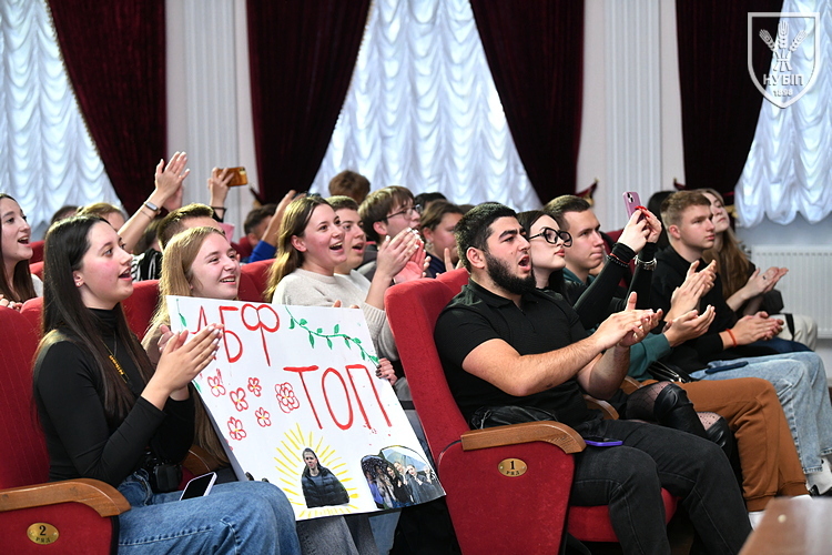 Так, ми усі розуміємо, що маємо можливість навчатись і творити, бо сьогодні нас захищають ангели-охоронці — Збройні Сили України. Але усі впевнені: прийде той переможний день, коли над Україною засяє мирне сонце. Про це пісенною композицією «Той день» зверталися до присутніх майбутні юристи. Першокурсників підтримали їх старші товариші, які на сцені не вперше, тому юристи були кращими у номінації «За сценічну культуру».