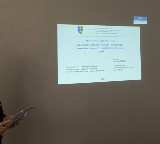 Постольний Марія "Перспективні напрямки створення та використання тривимірних моделей у геопорталі для військових потреб". Керівник - д.е.н., доц. Кошель А.О.