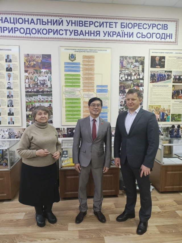 Вчений секретар музею історії НУБіП України кандидат філологічних наук, доцент Тетяна Чумак, Надзвичайний і Повноважний Посол В'єтнаму в Україні Нгуєн Хоан Тхань, проректор з науково-педагогічної роботи та міжнародної діяльності Олександр Миколайович Лабенко.