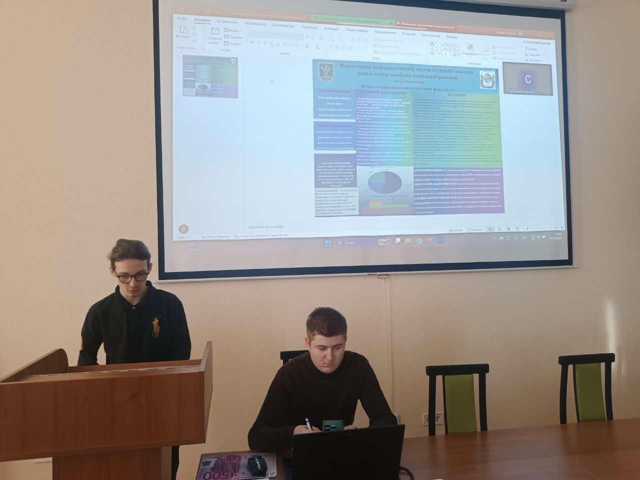 Тематика презентації була присвячена формуванню здорового способу життя студентів засобами соціальної реклами. Студент представив змістовний аналіз комунікаційних стратегій, прикладів ефективних соціальних кампаній та механізмів їх адаптації до університетського середовища. Магістрант наголосив на практичній вагомості роботи, яка може стати основою для створення дієвих профілактичних програм.