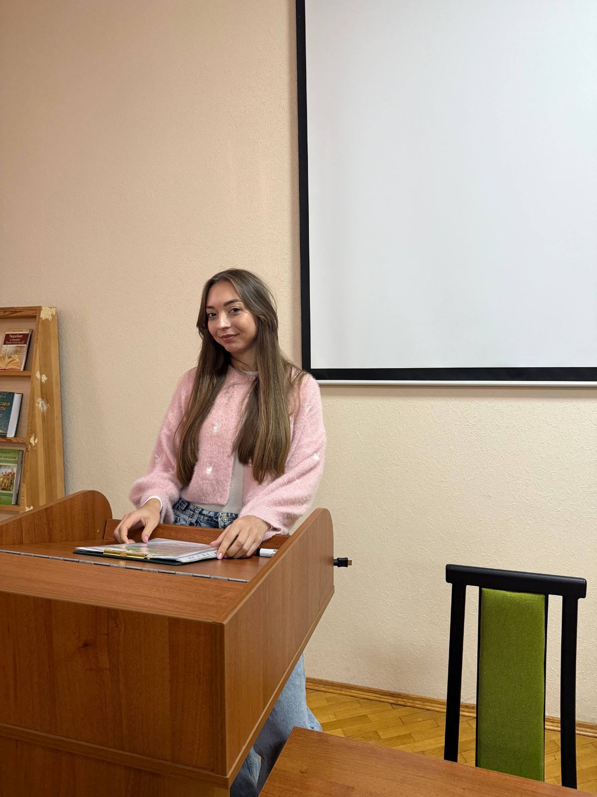Студентка представила роботу, що стосується формування культури професійного спілкування майбутніх педагогів. Викладачі відзначили чітко вибудувану систему критеріїв оцінювання комунікативної культури та аргументованість представлених педагогічних умов. Практична цінність полягає у можливості використання результатів у процесі фахової підготовки педагогів.