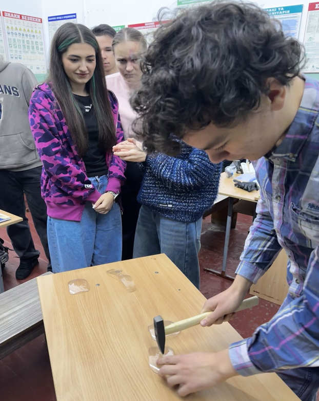 Студенти не лише ознайомилися з конструкцією та призначенням кожного виду спорядження, а й провели практичні випробування захисних окулярів на міцність лінз. Під час експерименту було продемонстровано, як спеціальне покриття лінз UVEX забезпечує стійкість до механічних пошкоджень, запотівання та подряпин, що є важливим для безпечної роботи в умовах агропромислового виробництва.