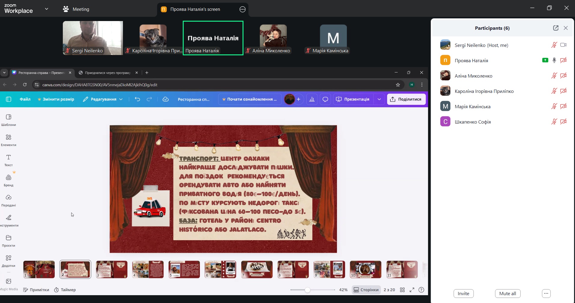 Під час одного із засідань ми розглядали питання туристичної логістики та сервісу, зокрема особливості транспорту, розміщення та пересування туристів у популярних дестинаціях для гастрономічних турів. На прикладі гастрономічних маршрутів і рекомендацій для мандрівників обговорювали, як логістичні рішення впливають на якість туристичного досвіду. Окрему увагу приділили подачі інформації для гостей у зрозумілому та візуально привабливому форматі.