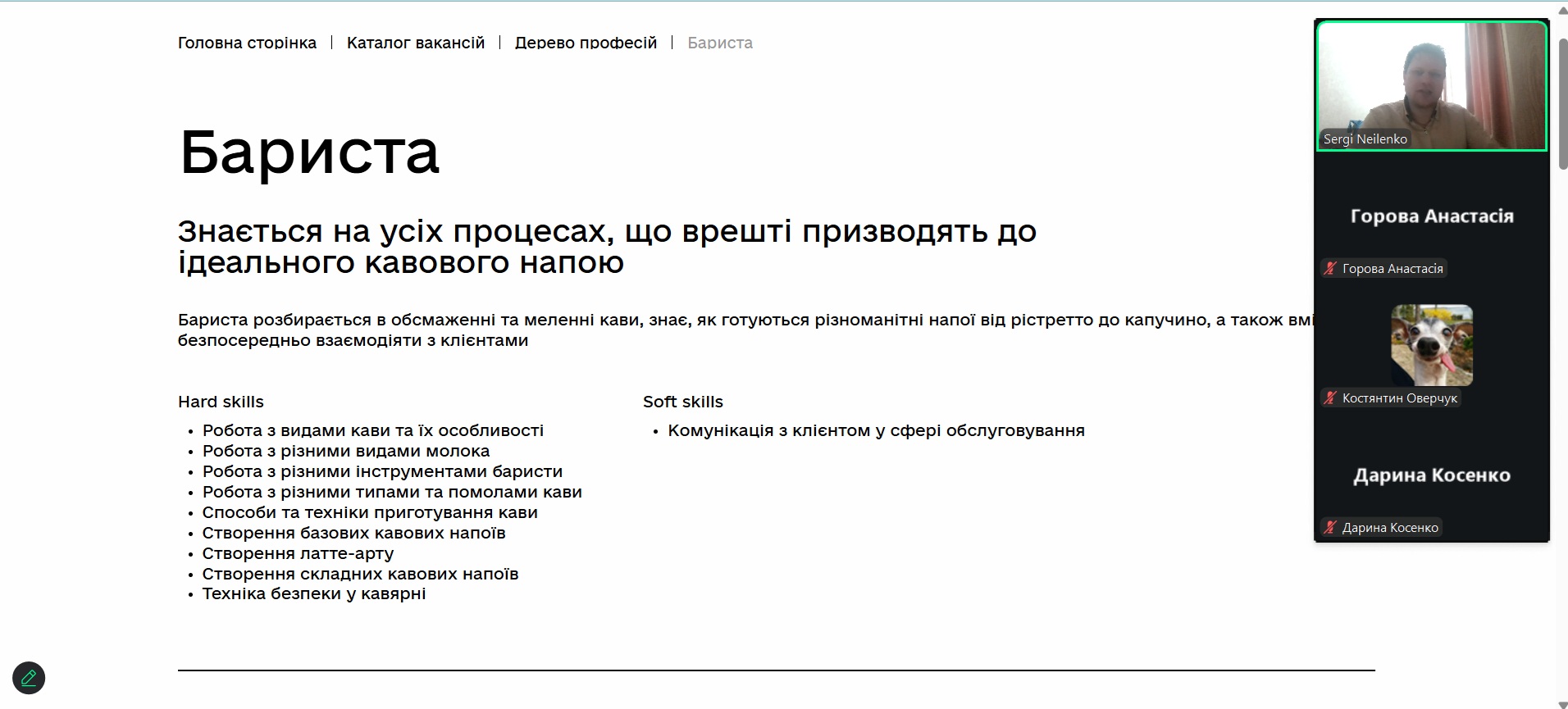 Окремий блок був присвячений професії бариста та кар’єрним можливостям у кавовій індустрії. Учасники гуртка розглядали hard та soft skills, необхідні для успішної роботи в сучасній кав’ярні. Було проаналізовано знання щодо видів кави, помелу, технік приготування напоїв і комунікації з гостями. Це допомогло краще зрозуміти вимоги ринку праці у сфері HoReCa.