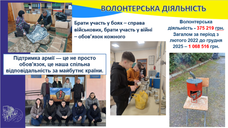 Зрозуміло, що це крапля в морі, але колектив усвідомлює, що кожна краплина, зібрана докупи, створює потужний потік води, здатен як допомогти своїм, так і знищити супротивника. За звітний період зібрано 375 219 грн. Загалом з лютого 2022 року до грудня 2025 року волонтерські збори становлять 1 068 516 грн.