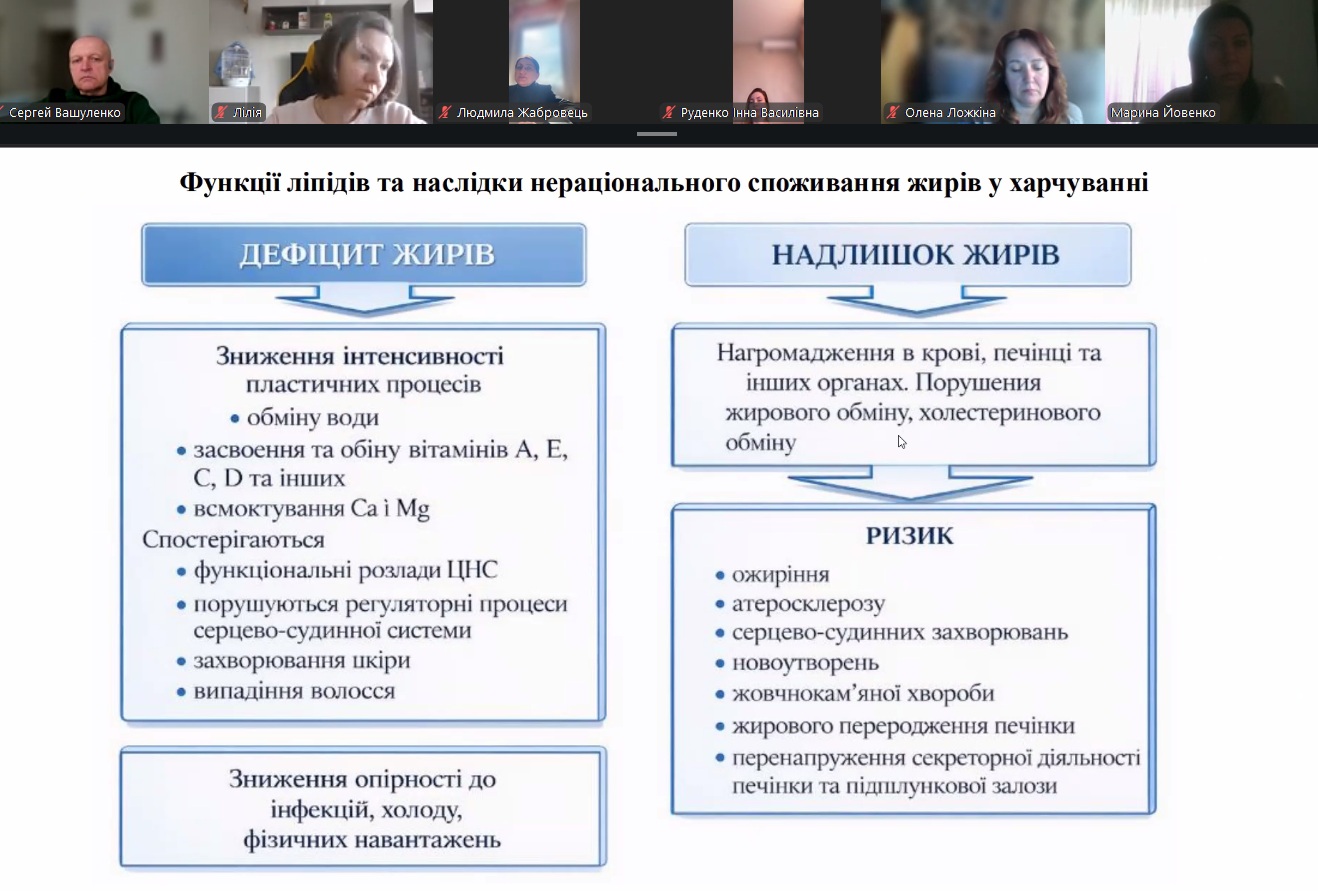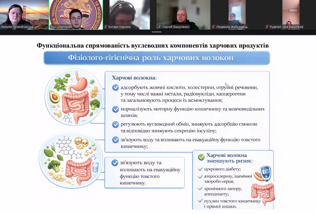 Під час лекції Ігор УСТИМЕНКО для здобувачів вищої освіти розкрив такі питання – наукове обгрунтування потреб нутрієнтів для організму людини; біологічна цінність білку харчових продуктів; конструювання рецептур харчових продуктів зі збалансованим білковим складом; сучасні медико-біологічні положення утилізації білку в організімі людини; наслідки нераціонального споживання жирів у харчуванні; принципи формування показників біологічної ефективності жирових компонентів харчових продуктів; функціональна спрямованість вуглеводних компонентів харчових продуктів; модифікована формула енергетичної цінності, створена на основі медико-біологічних уявлень.