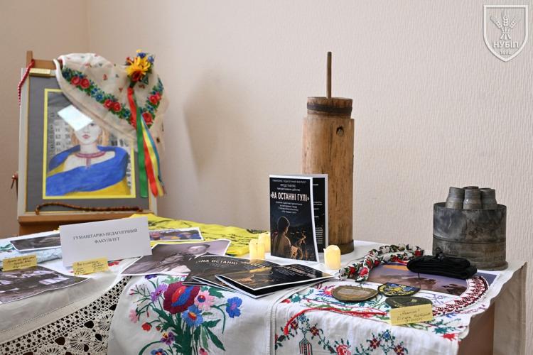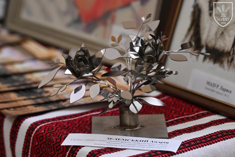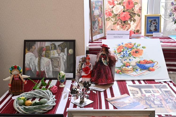 До початку перегляду конкурсних програм на сцені, які цьогоріч проходять під гаслом «Натхненні класикою — загартовані війною», Гербова зала університету стала місцем виставки творчих робіт студентів та викладачів університету у царині образотворчого, декоративно-вжиткового мистецтва (фотографії, живопису, графіки, декоративного розпису, оригамі, квілінгу, аплікації, колажу, вишивки, лозоплетіння і т.ін). Вражало розмаїття технік, стилів, форм, палітри того, що можна було побачити, але ж і представлення експозицій було надзвичайно колоритним, що відразу відзначили членкині образотворчого журі Олеся ВАРКАЧ (художник-графік, ілюстратор книг, членкиня Національної спілки художників України), Галина ЗАБАШТА (доценка кафедри мистецтва текстилю, вишивки та костюма Київської державної академії декоративно-прикладного мистецтва і дизайну імені Михайла Бойчука, членкиня Національної спілки художників України, лавреатка премії імені Катерини Білокур, заслужений діяч мистецтв України), Наталя ДЯЧЕНКО-ЗАБАШТА (старший викладач кафедри мистецтва текстилю, вишивки та костюма, спеціалізації «Арткостюм» Київської державної академії декоративно-прикладного мистецтва і дизайну імені Михайла Бойчука, членкиня Національної спілки художників України). «Приведемо сюди своїх студентів, — казали мисткині, — нехай подивляться, що таке справжній, а не формальний дух української творчості!»