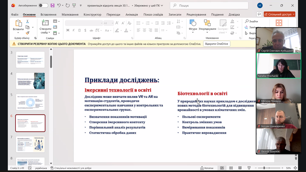 30 жовтня 2025 року на кафедрі управління та освітніх технологій факультету гуманітарно-педагогічних наук НУБіП України відбулася відкрита лекція професора Наталії ГРЕЧАНИК на тему «Роль дослідника в сучасній освіті: між наукою, менеджментом і правом» в межах викладання нормативної дисципліни «Методологія та організація наукових досліджень з основами інтелектуальної власності».