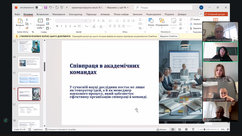 Заняття об’єднало здобувачів кафедри магістерського рівня ОПП «Управління персоналом», ОПП/ОНП «Управління закладом освіти», викладачів кафедри, для яких розвиток наукової культури, методологічної грамотності та управлінського мислення є важливою умовою професійного зростання.