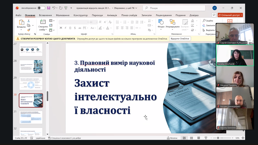Важливим аспектом лекції став правовий вимір наукової діяльності. Було наголошено на необхідності формування правової культури дослідника, зокрема знання норм інтелектуальної власності, механізмів патентування, ліцензування й етичного використання наукових результатів. Правова грамотність є запорукою академічної доброчесності та відповідального ставлення до авторського права. Лектор докладно зупинилася на типових формах академічних порушень – плагіаті, фальсифікації, самоплагіаті – пояснивши, що вони підривають довіру до науки й репутацію інституцій, тому кожен дослідник має дотримуватися принципів прозорості, точності цитування та чесності у представленні результатів.