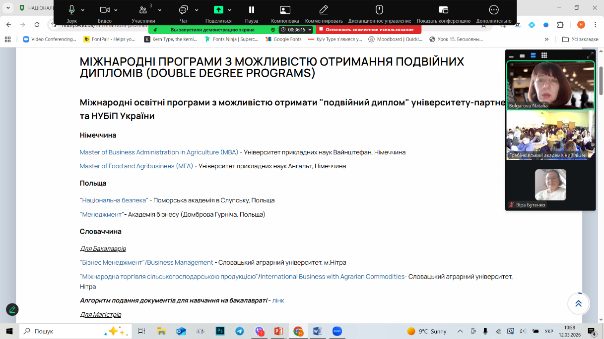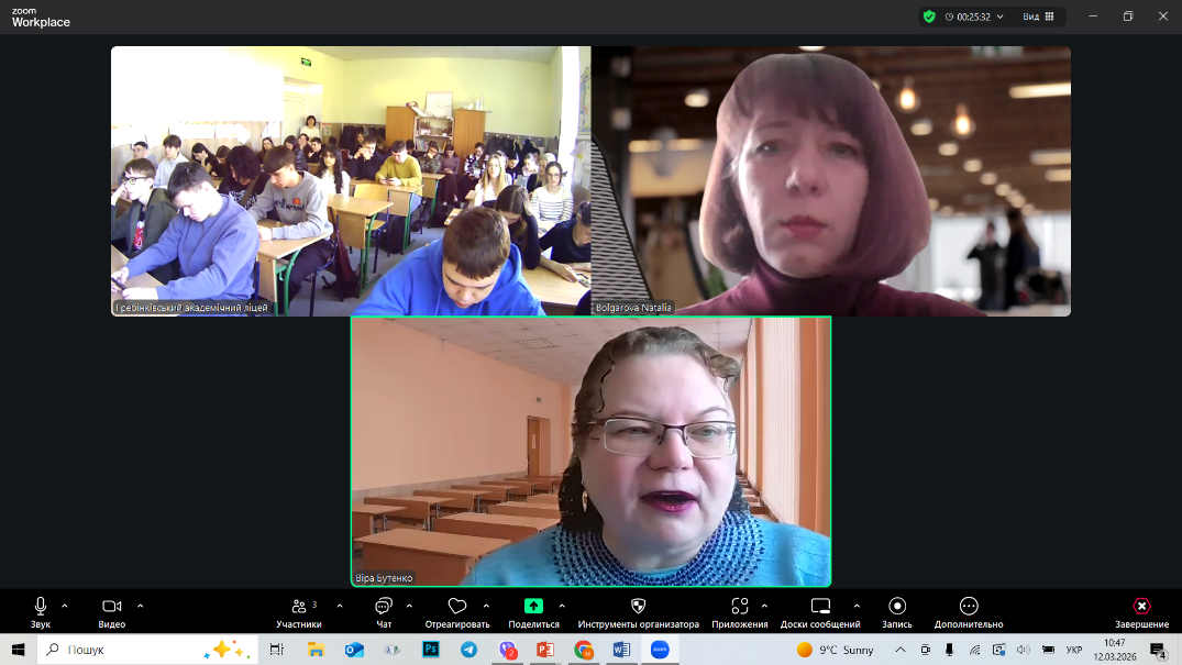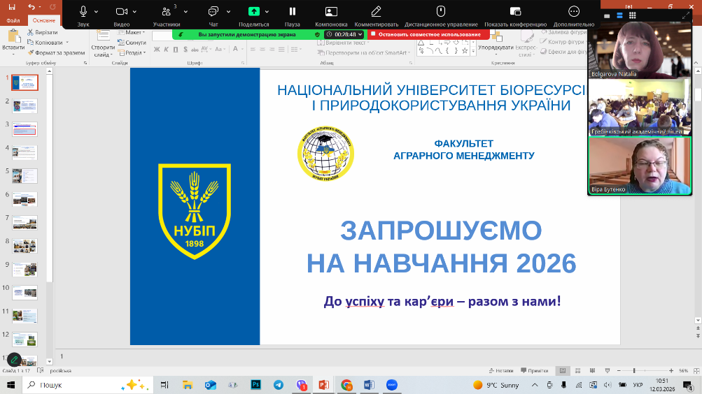 12.03.2026 р. доцент кафедри економічної теорії Наталя БОЛГАРОВА та гарант освітньої програми «Менеджмент» професор кафедри економічної теорії Віра БУТЕНКО провели профорієнтаційний захід популяризуючи університет серед випускних класів навчального закладу Гребінківського академічного ліцею у Київській області.