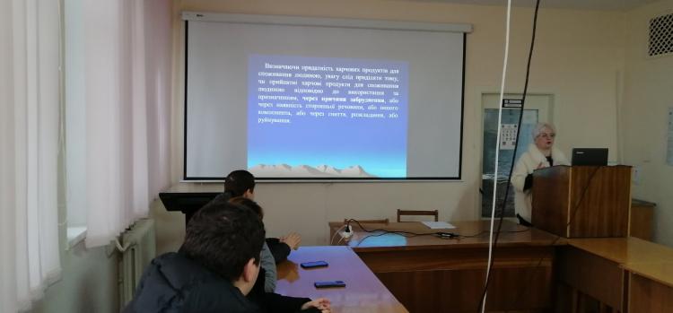 Під час першої теоретичної частини заходу професор Світлана ТКАЧУК висвітлила питання щодо: вимог чинного національного і європейського законодавства до гігієни рослинних харчових продуктів; порядку проведення випробувань продуктів рослинного походження; гігієнічних основ зберігання рослинних харчових продуктів; загальної характеристики найбільш поширених хвороб і пошкоджень рослинних харчових продуктів.