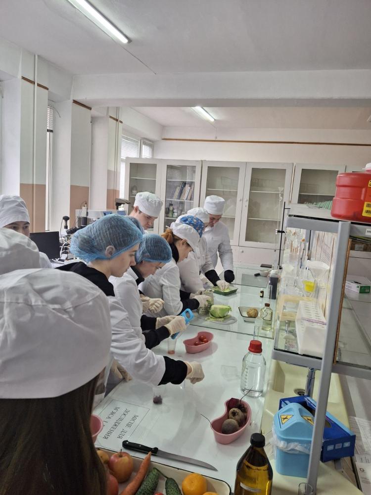 Практичну частину майстер-класу проведено в навчально-науковій лабораторії «Гігієни харчових продуктів». Доцент Тетяна ТАРАН висвітлила питання підготовки проб рослинних харчових продуктів до проведення випробувань, зокрема з визначення вмісту нітратів, ознайомила учасників майстер-класу з роботою нітратоміру Н-401.