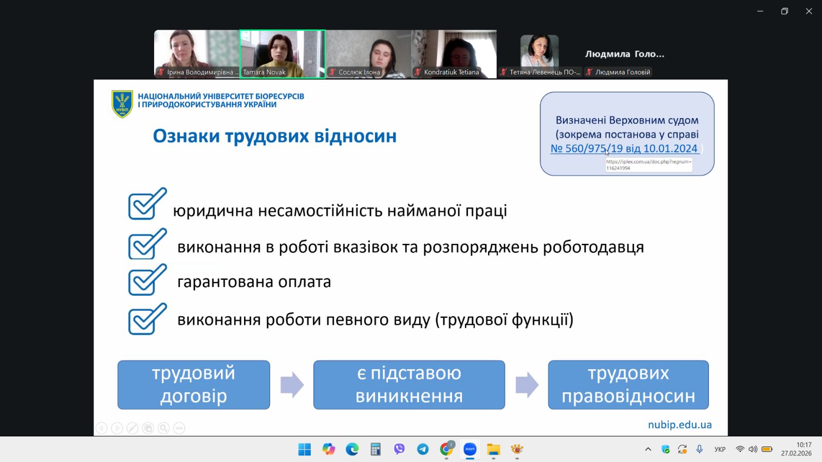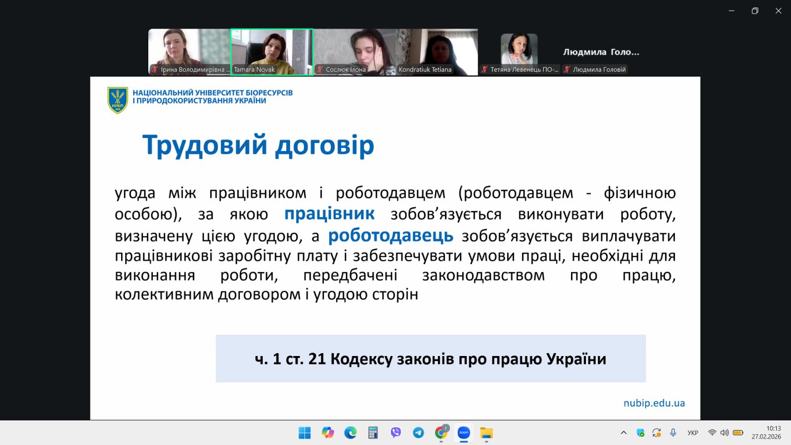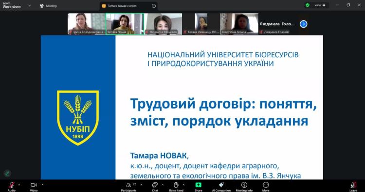 Тему «Поняття, зміст та порядок укладення трудового договору» представила к.ю.н., доцент кафедри аграрного, земельного та екологічного права імені акад. В. З. Янчука Тамара НОВАК.