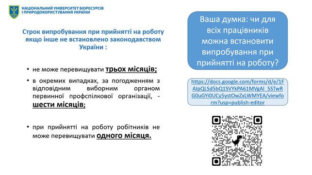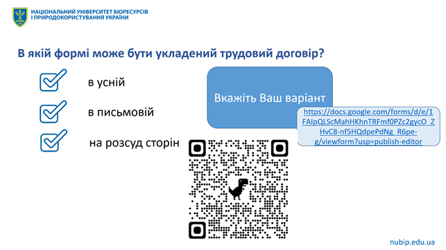 Особливий інтерес викликало використання Google Forms як інтерактивного інструменту для визначення позиції студентів щодо окремих дискусійних аспектів, зокрема щодо істотності окремих умов договору та допустимості встановлення додаткових вимог під час прийняття на роботу. Такий формат сприяв активній участі аудиторії та формуванню навичок аргументованої правової дискусії.