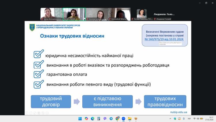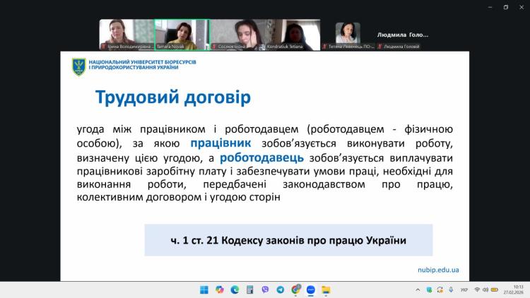 Окрему увагу лекторка приділила особливостям правового регулювання укладення трудових договорів в умовах воєнного стану, з урахуванням змін у трудовому законодавстві та практичних викликів, що постають перед працівниками і роботодавцями.