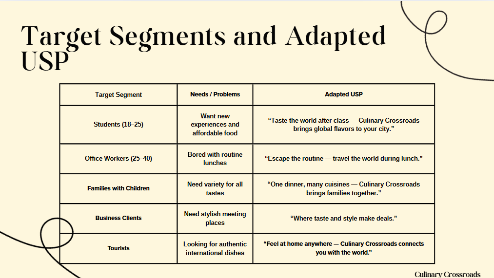 Студенти розробляли айдентику, визначали місію і стратегічні цілі розвитку бренду, продумували складові комплексу маркетингу, визначали цільову аудиторію, будували аватари клієнтів, розробляли матрицю цінності продукту під кожного аватара, створювали унікальну торгову пропозицію, продумували шлях клієнта до здійснення покупки і які саме інструменти діджитал-маркетингу можна використати на кожному кроці, проводили аналіз конкурентів із використанням таких інструментів як SimilarWeb, SerpStat, Fanpage karma, Meta Ad Liblary тощо.