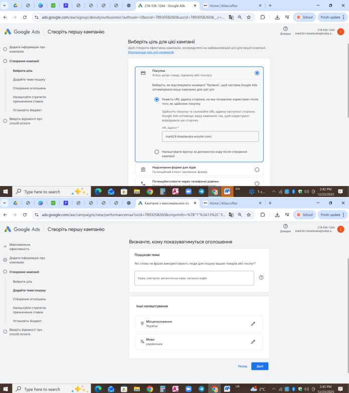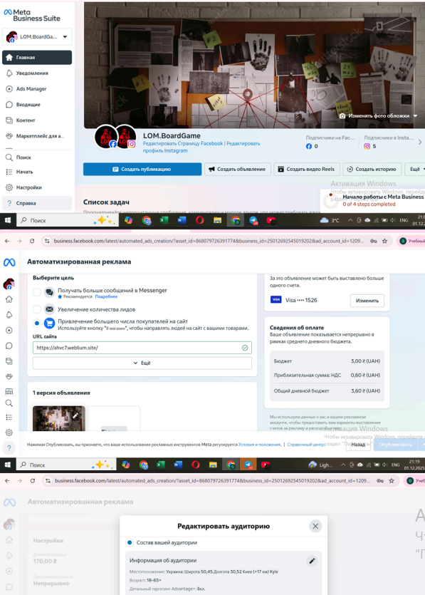 Наступним кроком була розробка повноцінного сайту на конструкторах Wix або Weblium, створення бізнес-сторінок у Facebook та Instagram, їх зв’язування та налаштування реклами через кнопку «Просувати» та через рекламний кабінет Ads Manager з детальним визанченням цільової аудиторії та підбором креативів і рекламних текстів. Також студенти спробували розібратися з роботою Google Ads та особливостями налаштування реклами.